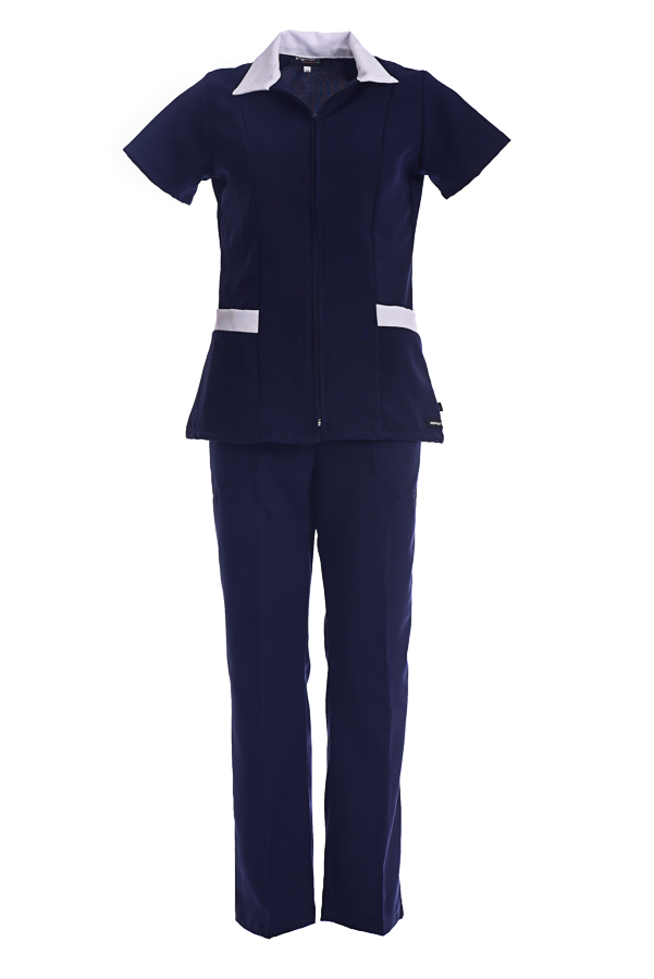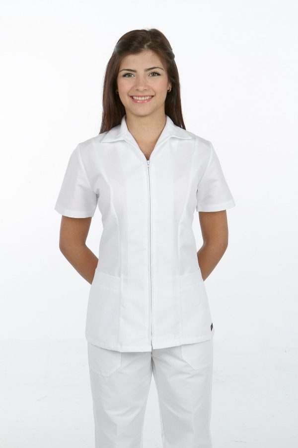 Conjunto liso con cierre al frente, corte princesa en frente y espalda, 2 bolsas laterales, cordones ajustables en la espalda. Pantalon jareta ajustable con elastico y 2 bolsas delanteras. 100% Poliester. Linea Ampersand