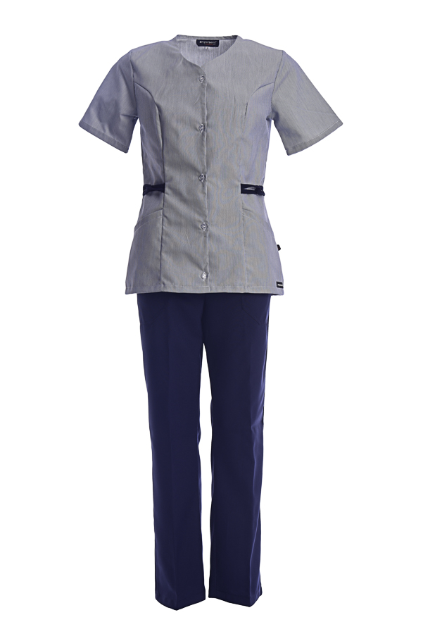 Conjunto liso con botones, tiritas azules al frente, 2 bolsas laterales, cordones ajustables en la espalda. Pantalon jareta ajustable con elastico y 2 bolsas delanteras. 100% Poliester. Linea Ampersand