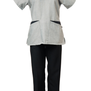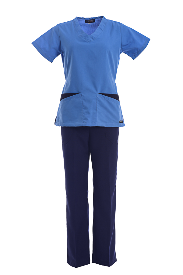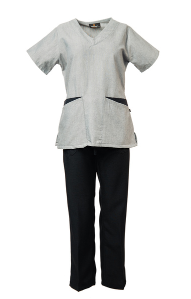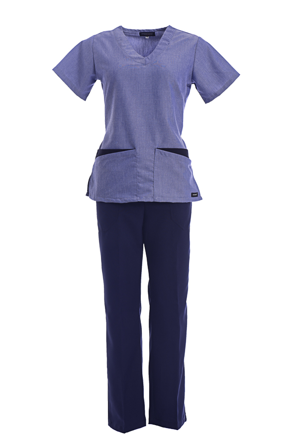 Filipina cuello V, con doble bolsa al frente y cordones ajustables en la parte de atras 70 % poliester 30% algodón, pantalon con elastico y jareta, 2 bolsas delanteras, 100 % poliester.