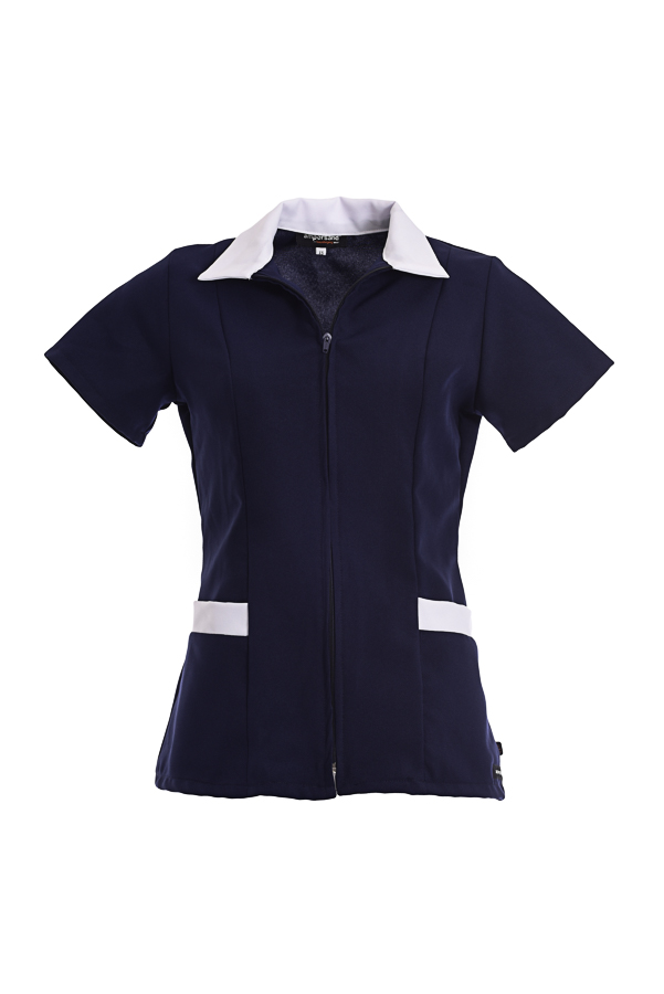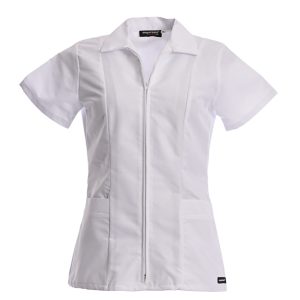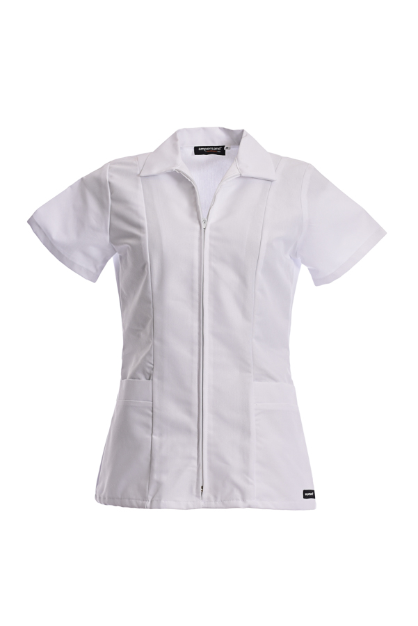 Filipina lisa con cierre al frente, corte princesa en frente y espalda, 2 bolsas laterales, cordones ajustables en la espalda. 100% Poliester. Linea Ampersand